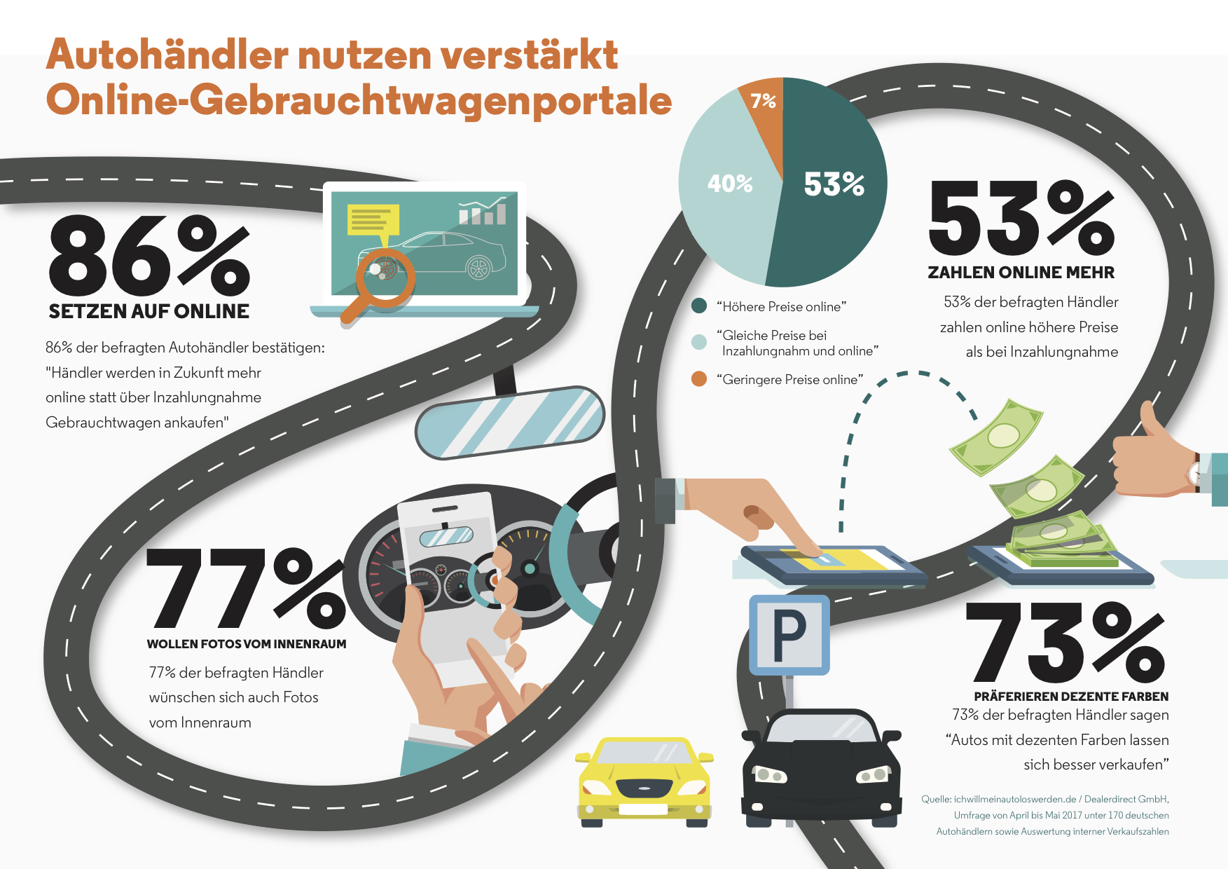 Grund für die Beliebtheit der Gebrauchtwagenportale ist der einfachere Weg des Verkaufs für Autobesitzer beziehungsweise des Ankaufs für Händler. Dabei legen deutsche Autohändler großen Wert auf detaillierte Beschreibungen der angebotenen Fahrzeuge. Aussagekräftige Fotos des Autos sind wichtig, um ein gutes Angebot unterbreiten zu können. 77% aller befragten Händler stimmen sogar der Aussage zu, dass auch Fotos vom Innenraum des Fahrzeugs wichtig sind, um den Wert beurteilen zu können. Beim Thema Farbe geben 73% der befragten Autohändler an, Autos mit dezenten Farben ließen sich grundsätzlich besser verkaufen; immerhin 27% machen die Farbe vom Fahrzeugtyp abhängig, wie das Paradebeispiel eines knallroten Ferrari zeigt. Für Besitzer von Kleinwagen ist der Hinweis zur dezenten Lackierung dennoch hilfreich, gerade wenn es um die Anschaffung eines Wagens geht der später wiederverkauft werden soll.